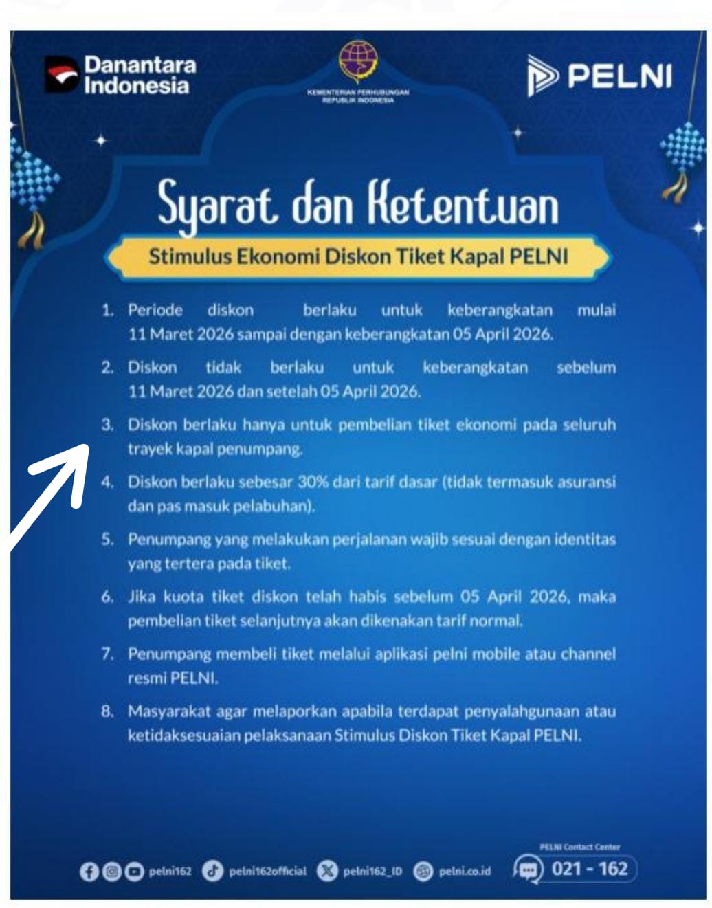 Program diskon sebesar 30 persen ini berlaku khusus untuk tiket kelas ekonomi di seluruh trayek kapal penumpang PELNI. Penjualan tiket telah dibuka sejak 11 Februari 2026, dengan jadwal keberangkatan periode 11 Maret hingga 5 April 2026. PELNI memproyeksikan sekitar 445 ribu penumpang akan memanfaatkan program tersebut.