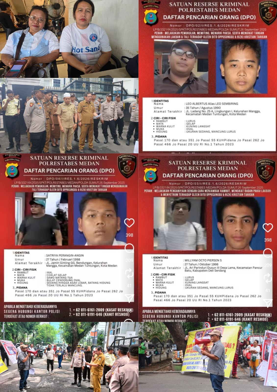 Aksi tersebut digelar sebagai bentuk protes atas belum tertangkapnya tiga tersangka berstatus Daftar Pencarian Orang (DPO), yakni Leo Albertus alias Leo Sembiring, Satrya Peranginangin, dan William, yang telah ditetapkan sejak awal Februari 2026 oleh Polrestabes Medan.