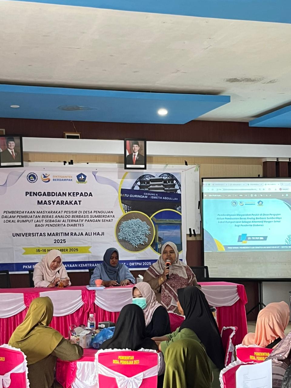 Pengabdian kali ini mengangkat tema “Pemberdayaan Masyarakat Pesisir di Desa Pengujan dalam Pembuatan Beras Analog Berbasis Sumberdaya Lokal Rumput Laut sebagai Alternatif Pangan Sehat bagi Penderita Diabetes.” Kegiatan dibuka oleh Kepala Desa Pengujan yang diwakili oleh Kaur Umum Desa, dan dihadiri oleh mitra utama yaitu Ibu-Ibu PKK, kader posyandu, serta para lansia.